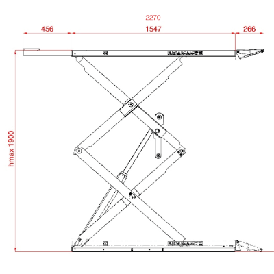 Elevador electrohidráulico de doble tijera, contacto con bastidor, perfil bajo equipado con rampas de entrada/salida traseras (L=267 mm) y extensiones telescópicas delanteras (L=456 mm) para llegar a los puntos de recogida de los vehículos más exigentes.